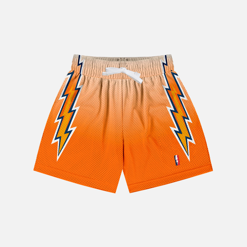100% HEAVYWEIGHT POLYESTER MESH, ZIPPER POCKETS, ELONGATED WAXED DRAWSTRINGS, EMBROIDERED LIGHTNING BOLT LOGO